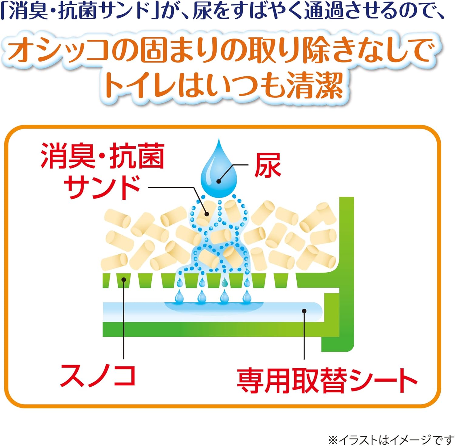 オシッコとウンチを強力消臭するデオトイレ専用取替サンドです。ミクロの穴でニオイを吸着して強力消臭・交換は月1回。1ヶ月交換不要※愛猫1頭(体重8kgまで)の場合・猫ちゃんの手に挟まりにくい大きさで、飛び散りにくく、お掃除もラクラク※デオトイレ取り替え専用消臭サンド(シリカゲル丸粒タイプ)比・粉立ちカットコーティング採用・撥水で足元サラサラ清潔。足元にオシッコを残しません。
